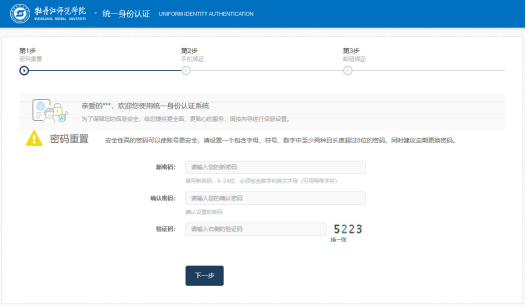 按照页面要求输入新密码、确认密码和验证码后,单击【下一步】